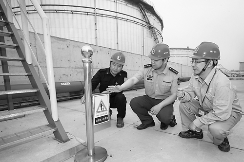 中石化扬子公司物流部针对夏季生产特点,加大防雷、静电隐患排查与检测力度,重点抓好罐区等关键部位防雷防静电措施落实,结合“我为安全作诊断”,增强设备巡查,消除跑、冒、滴、漏等现象,提高装置运行的抗风险能力。图为安全消防人员检查罐区除静电设施。