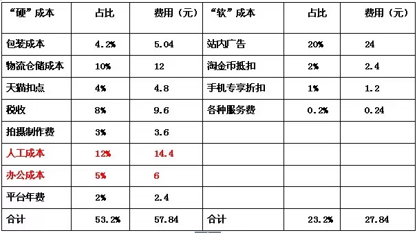 假定某产品的出厂价是40元,现在以120元的价格在天猫上出售。猛一看这利润有200%!这在消费者眼里这简直就是“奸商”啊!马克思的《资本论》说有商家利润有100%就敢践踏一切人间法律了,但在天猫上呢?请看下表: