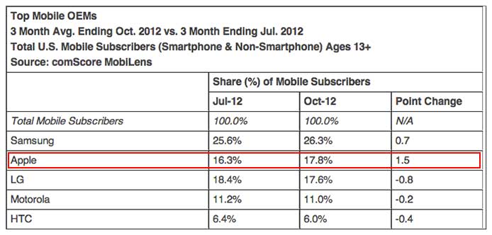 根据comScore MobiLens服务的数据,今年10月,苹果在美国手机市场的份额达17.8%,从7月的第三位上涨至第二位。总体而言,苹果iPhone(参数 图片 样张 评测)在截至10月底的三个月中,实现了1.5%的增长。而美国市场排名前五的手机制造商中,有三家出现下降——LG下降0.8%,摩托罗拉下滑0.2%,HTC损失0.4%;而三星则上涨0.7%,这也就意味着,苹果iPhone的增长达三星智能手机、功能手机综合的一倍。